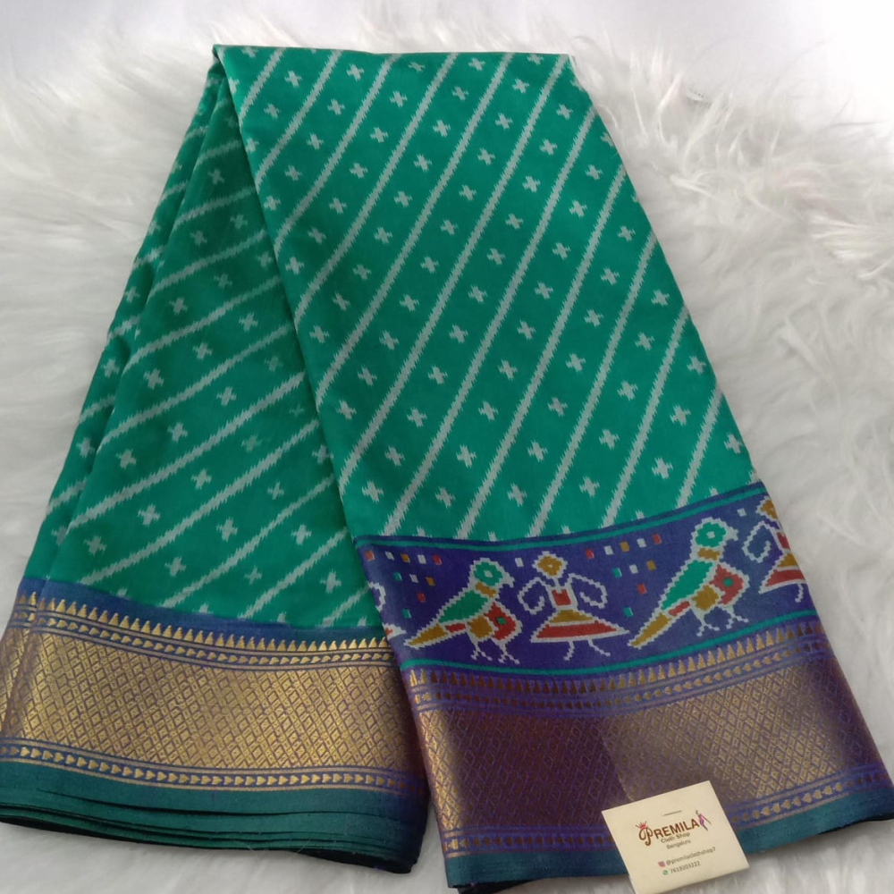 Chanderi Silk Saree with Pochampally Printed Green with Navy Blue