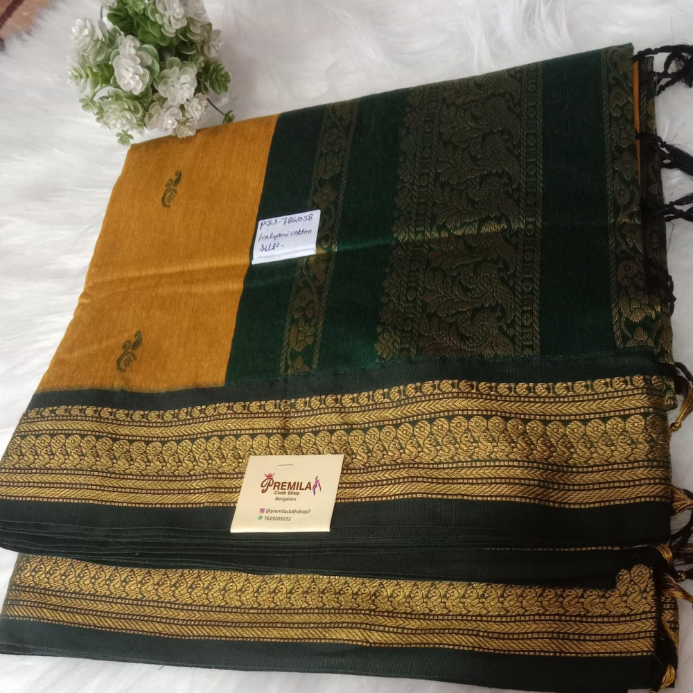 The hallmark of these sarees lies in their intricate weave patterns and vibrant hues, meticulously handcrafted by skilled artisans. Whether adorned with delicate zari work or adorned with traditional motifs inspired by nature and folklore, every Kalyani Cotton Saree tells a story of artisanal craftsmanship and artistic finesse.
