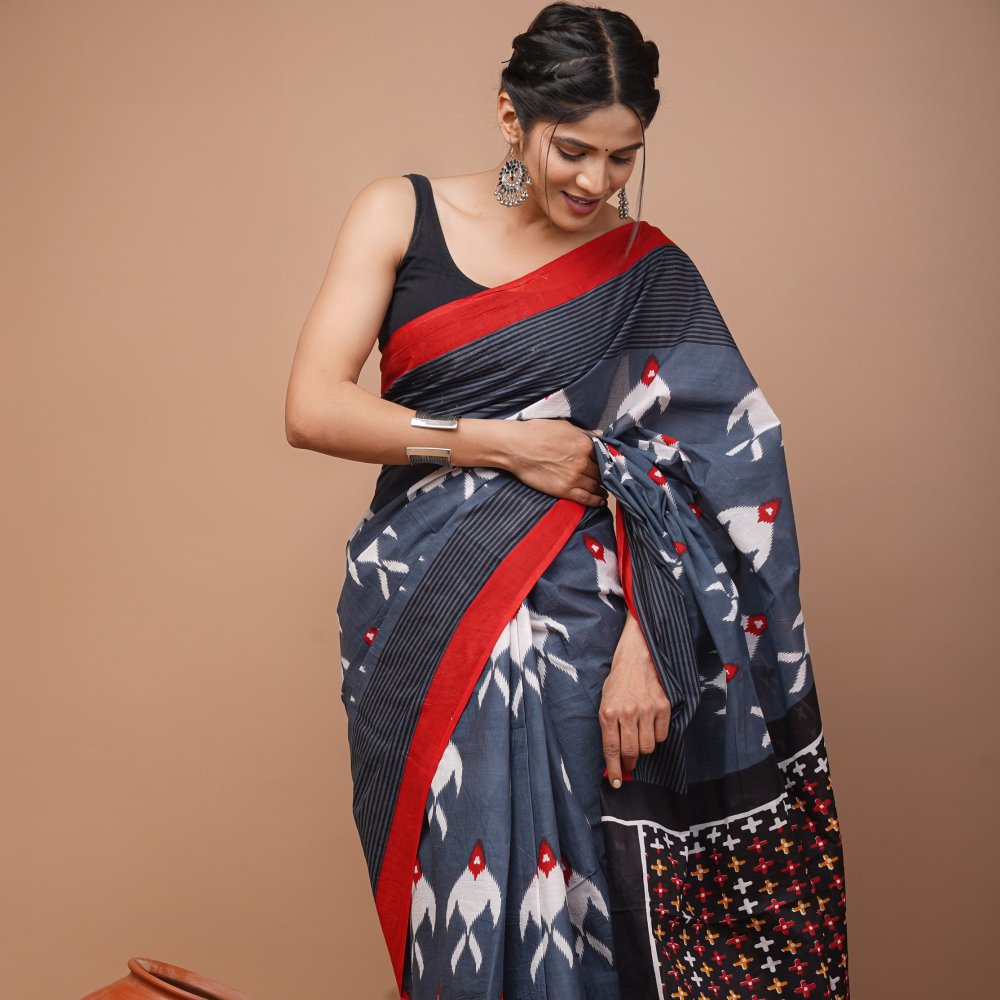Mul Mul Soft Cotton Saree Dark Grey with Red & White Printed