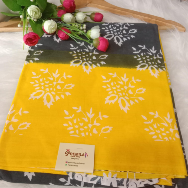 Mul Mul Soft Cotton Saree Grey with Yellow Floral Printed