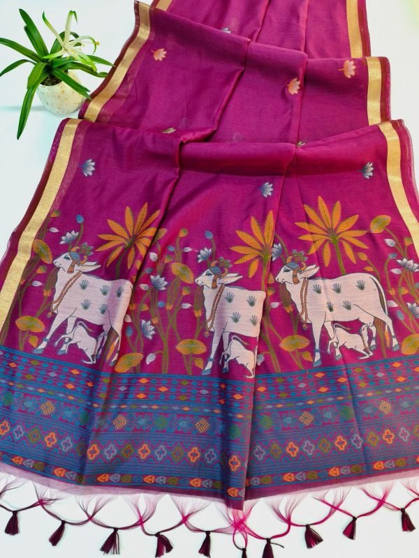 Premium Soft muga cotton saree with traditional pichwai weaving pallu & zari weaving border with all over colourful lotus weaving butties and Contrast blouse piece