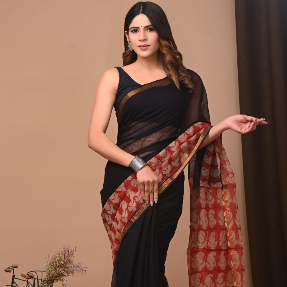 Printed Kota Doriya Sarees with Blouse Black with Red with Gold Zari